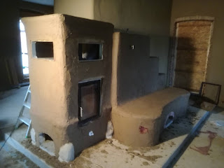 Grundofen mit Wärmebank,aufgesetzt und Grundputz